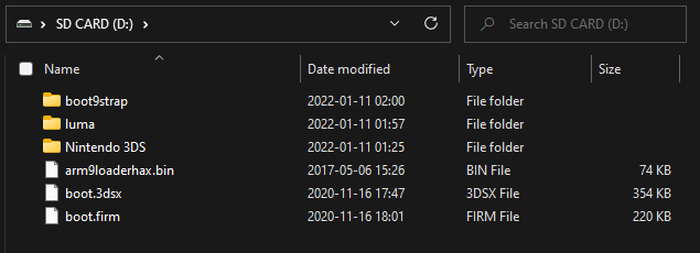 3. Copy everything from the latest Luma3DS .zip to the root of your SD card