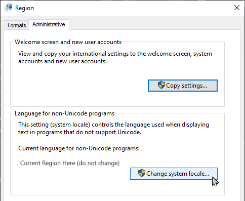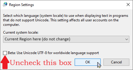 3. Uncheck the box next to Beta: Use Unicode UTF-8 for worldwide language support then click "OK"